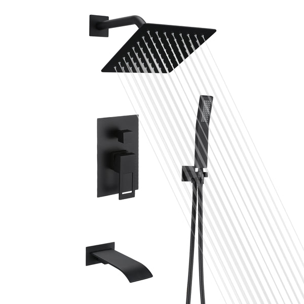 • 3. Dieses Duschsystem verfügt über drei Modi: Wasserfallauslauf, Regenduschkopf und Handbrause, die durch Drehen des quadratischen Knopfes am Ventil leicht umgeschaltet werden können. Mit dem Hebelgriff können Sie den Heiß-/Kaltwasserdurchfluss und die Temperatur einfach einstellen. Dieses Duschset verfügt über einen breiten Wasserfallauslauf mit großem Wasserdurchfluss (4,17 GPM bei 60 PSI), um Ihre Badewanne schnell zu füllen.