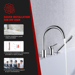 • 5. Ziehen Sie einfach den Knopf an der Rückseite des Auslaufs nach oben, um den Wasserfluss für Handbrause oder Auslauf zu ändern. Die Handbrause aus Messing mit geneigtem Winkel trägt dazu bei, Nässeschäden an Ihrem Holzboden zu verhindern, die durch das aus der Handbrause tropfende Wasser entstehen.