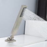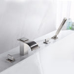 Dies ist ein moderner römischer Wannenhahn für die Deckmontage von Sumerain mit einem minimalistischen, stromlinienförmigen Design und einer eleganten Handbrause aus Messing, die das Baden zu einem wirklich angenehmen Erlebnis macht. Dieses Modell passt perfekt zu Badezimmern mit modernem Dekor. Der breite Auslauf mit dramatischem Wasserfalleffekt und einer hohen Durchflussrate von 2,2 GPM füllt Ihre Badewanne in kürzester Zeit. 5-Loch-Installation. Dieser Wasserhahn ist wartungsarm und leicht zu reinigen.