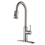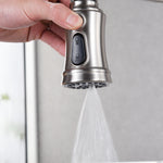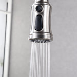 With a high-arc spout and a 360-degree swivel design, this kitchen faucet offers three convenient spray settings: stream, spray, and sheet.  Whether you're rinsing delicate glassware or scrubbing heavy-duty pots, you can effortlessly control the water flow to meet your specific needs.