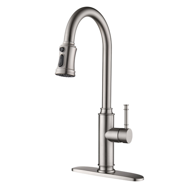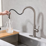 • Integrated Pull-Down Sprayer The single-handle operation of this kitchen faucet allows for simple and precise control of both water temperature and flow rate. This intuitive design makes it easy to find the perfect water settings for any task. The faucet features an integrated pull-out sprayer that automatically retracts, providing convenient and hassle-free use in your daily kitchen tasks.
