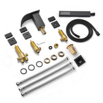 Im Lieferumfang sind Wasserfallauslauf, Duschventile, Handbrause, Schlauch und Griffe enthalten.
