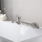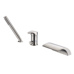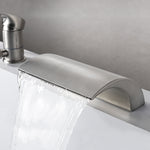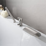 Dies ist ein moderner römischer Wannenhahn für die Deckmontage von SUMRAIN mit einem minimalistischen, stromlinienförmigen Design und einer eleganten Handbrause aus Messing, die das Baden zu einem wirklich angenehmen Erlebnis macht. Dieses Modell passt perfekt zu Badezimmern mit modernem Dekor. Der breite Auslauf verfügt über einen dramatischen Wasserfalleffekt und füllt Ihre Badewanne in kürzester Zeit. Dieser Wasserhahn ist wartungsarm und leicht zu reinigen. Die Handbrause aus Messing mit geneigtem Winkel trägt dazu bei, Nässeschäden an Ihrem Holzboden zu verhindern, die durch das aus der Handbrause tropfende Wasser entstehen.