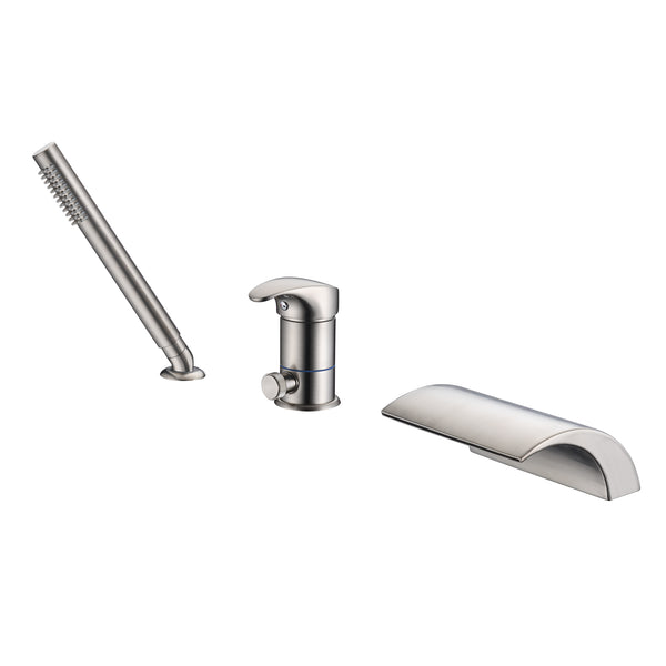 Römischer Wannenhahn zur Deckmontage mit minimalistischem, stromlinienförmigem Design. Die hochwertige Oberfläche aus gebürstetem Nickel ist abrieb- und korrosionsbeständig. Die Handbrause aus Messing mit geneigtem Winkel verhindert nasse Schäden an Ihrem Holzboden, die durch tropfendes Wasser aus der Handbrause entstehen.