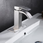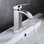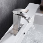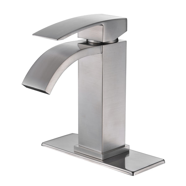 SUMERAIN Badezimmer-Wasserfall-Wasserhahn mit nach unten gebogenem, flachem Auslauf – Verschönern Sie Ihren Badezimmerwaschtisch mit diesem Artikel! Dieser kurze Wasserhahn mit Einhebelgriff zeigt ein modernes und elegantes, schlichtes Design mit einem nach unten gebogenen flachen Auslauf, der einen wasserfallähnlichen Wasserfluss nachbildet. Dieser Wasserhahn bietet hervorragende Leistung, vereinfachte Installation und einfache Wartung. Die solide Messingkonstruktion des Wasserhahns sorgt für jahrelange Effizienz und Haltbarkeit. Der mit gebürstetem Nickel lackierte Wasserhahn eignet sich perfekt für moderne Einrichtungen. Es verfügt über eine Keramikscheibenkartusche, die einen reibungslosen und langlebigen Betrieb ermöglicht. Es verfügt über einen Wasserfall-Waschtischhahn und eine Einhebelbedienung. Der SUMERAIN Wasserfall-Waschtischarmatur ist ein avantgardistisches Design und verleiht dem Badezimmer eine Aura der Raffinesse!